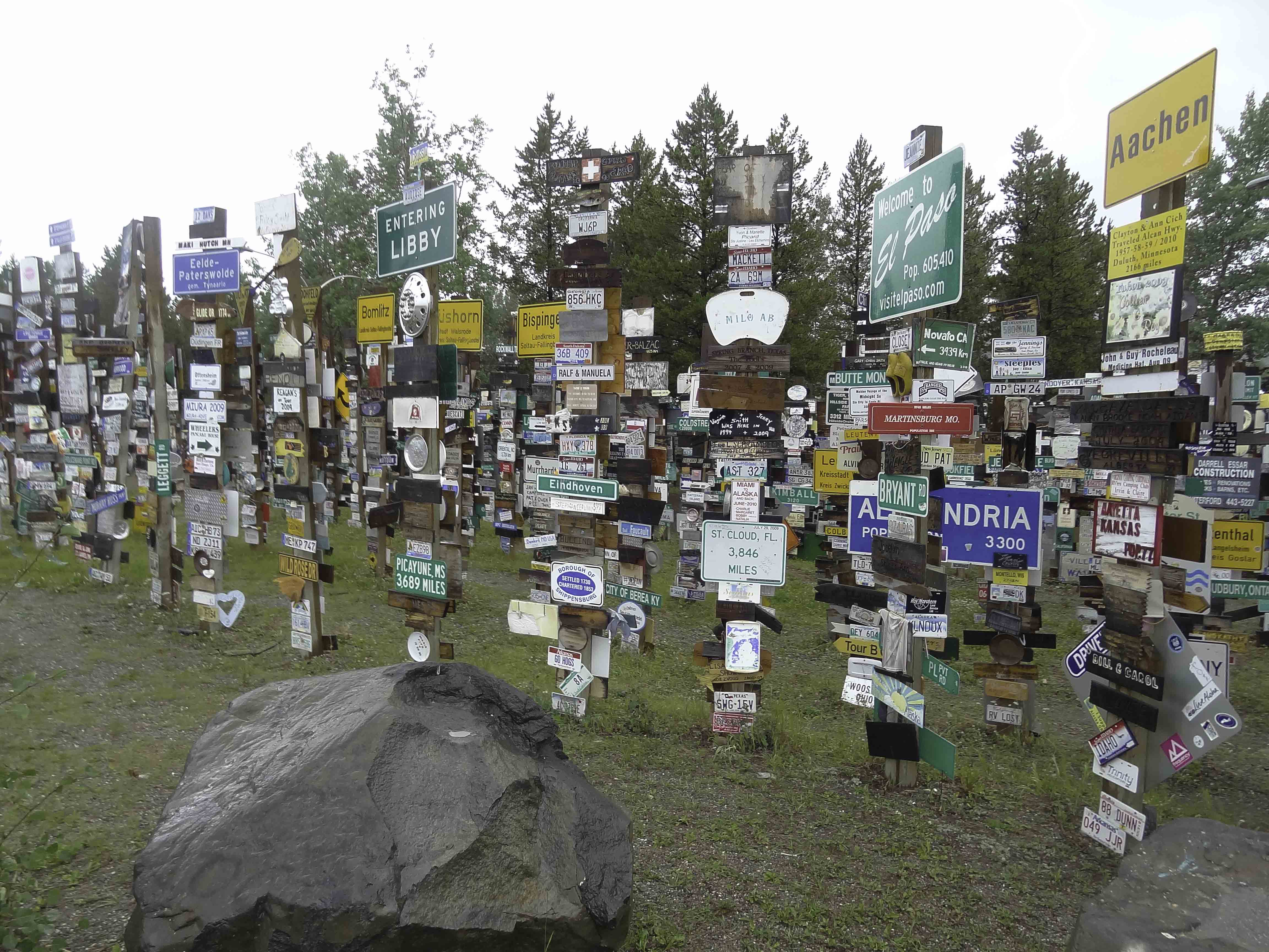 Day 15. Watson Lake, Yukon Territories. It rained all night, not hard but constant. For the first time we used the inverter which turns the 4x6volt batteries to 110volt electricity to run the Cappuccino machine and the microwave. Worked great. We can’t start the day without our Cappuccinos! There were many Bison on the road to Watson Lake. Pretty drive, but it could have been Colorado, but CO has much better roads. We set up in the rain at the Downtown RV Park. It is an ok park but no Wi-Fi even though it is advertised. Later we walked over and met the group at the Sign Post Forrest to put up our group sign. There are over 80,000 signs now in this “forest.” Funny place. Signs from all over the world. One sign that stands out is “Welcome to El Paso”. Click here for pics of Watson Lake